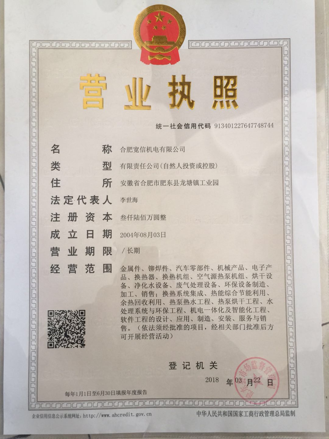 合肥寬信機(jī)電有限公司成立于2002年,是從事熱交換器、余熱回收、煙氣廢氣熱回收與凈化處理、熱泵機(jī)組及其應(yīng)用、汽車零部件研發(fā)、制造、銷售與工程服務(wù)為一體的高新技術(shù)企業(yè)。公司位于合肥上海產(chǎn)業(yè)園,占地60畝,擁有40000多平方米標(biāo)準(zhǔn)化工業(yè)廠房,10000多平方米研發(fā)、營銷、服務(wù)綜合樓,各類生產(chǎn)、檢測、實驗設(shè)備300多臺套,科研技術(shù)開發(fā)團(tuán)隊50多人,自主知識產(chǎn)權(quán)及國家專利和研究成果60多項,在熱交換器、余熱回收、熱泵機(jī)組應(yīng)用、廢氣凈化處理方面都具有較強的實力。